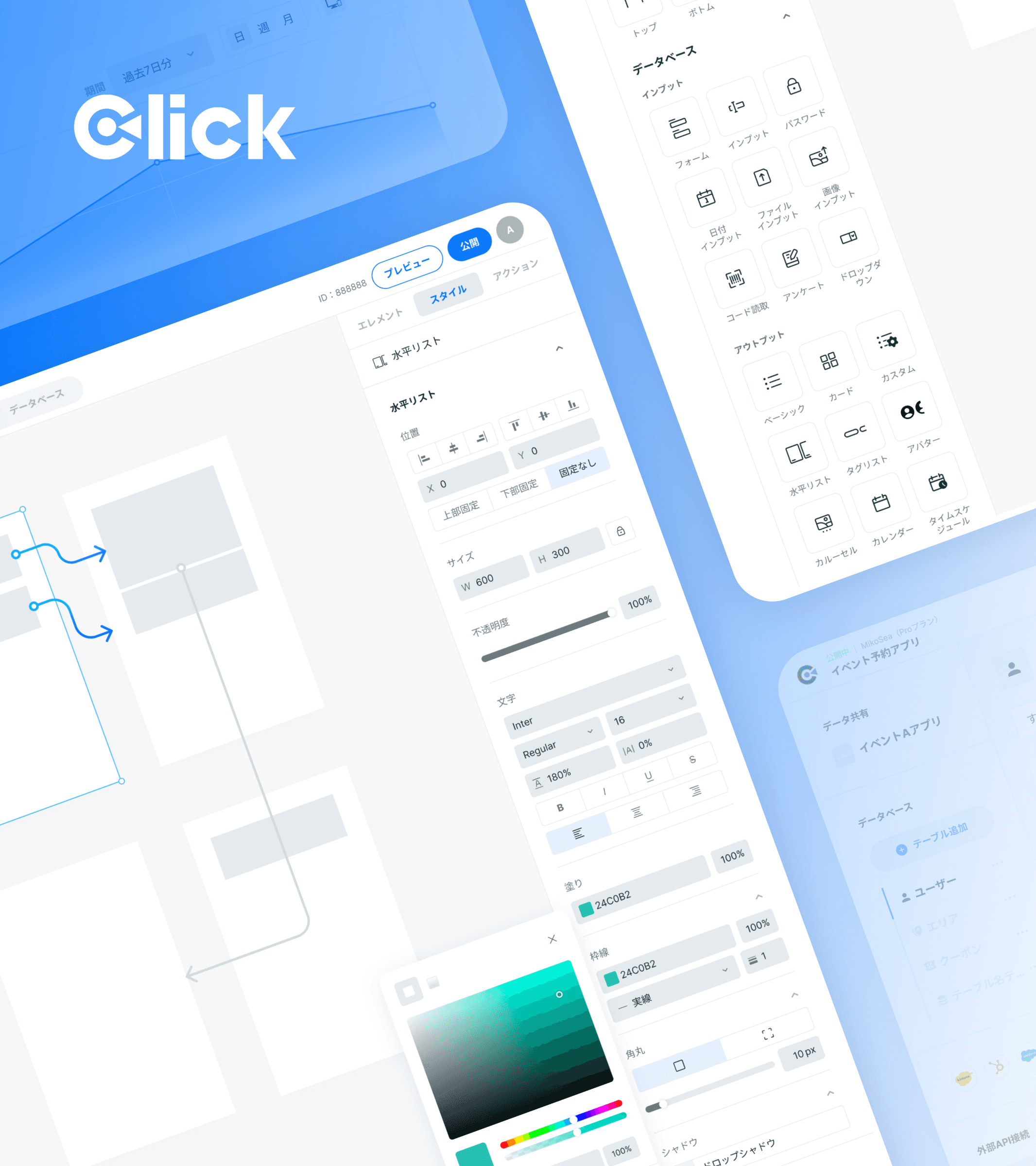 Clickはノーコードでアプリを開発できる日本発のプラットフォームです。コードを書かずに、誰でも簡単にiOS / Android / Webのアプリを開発できるサービスを提供しています。ユーザー数の急速な拡大に伴い、UI/UX全体の見直しが急務となり、大規模なフルリニューアルプロジェクトが立ち上がりました。NOROSHIは競合リサーチから機能要件整理、ユーザー体験設計、UIデザインまで一気通貫で伴走し、段階的なリニューアルを支援しています。