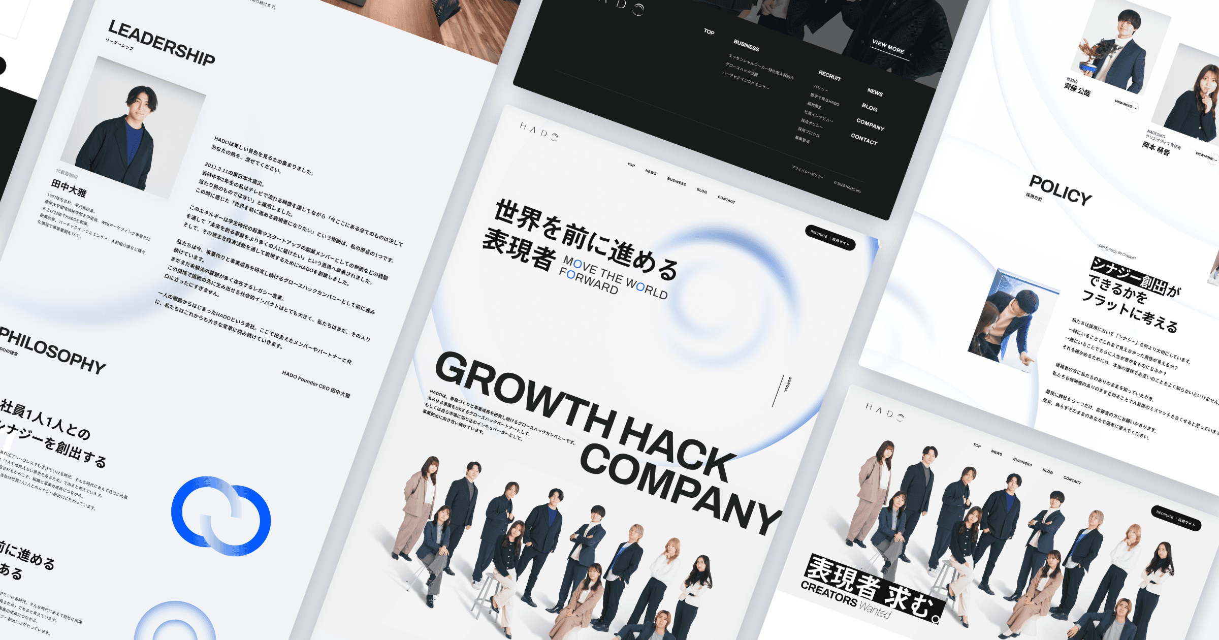 株式会社HADOは、事業づくりと事業成長を研究し続けるグロースハックカンパニーです。これまでグロースハック事業を中心に展開してきましたが、エッセンシャルワーカー向けの人材紹介事業やバーチャルインフルエンサー事業など、多角的な事業展開を進める中で、採用力の強化が急務となっていました。NOROSHIは、HADOの採用ブランドを確立し、求職者とのミスマッチを減らすことを目的に、コーポレートサイトのリニューアルを担当。HADOのカルチャーをより鮮明に伝えるため、求職者がHADOの価値観を直感的に理解できるサイトを制作しました。
